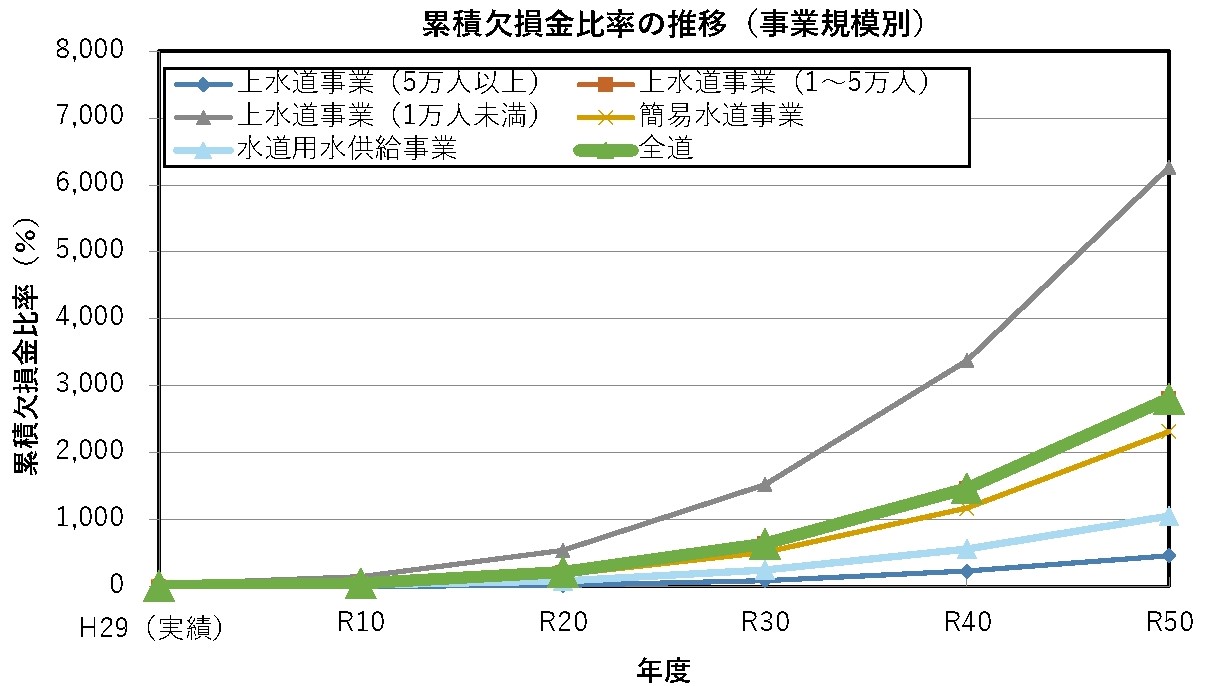 • 給水人口1万人未満の上水道事業は、累積欠損金比率(赤字比率)がR50年度には6,000%を超え大きく上昇する見込み