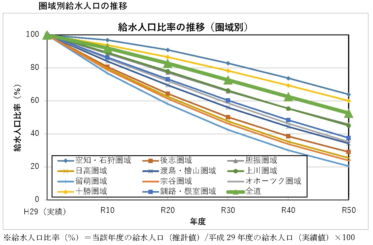 空知・石狩圏域と十勝圏域を除き、R50年度には給水人口が半分以下となる見通し