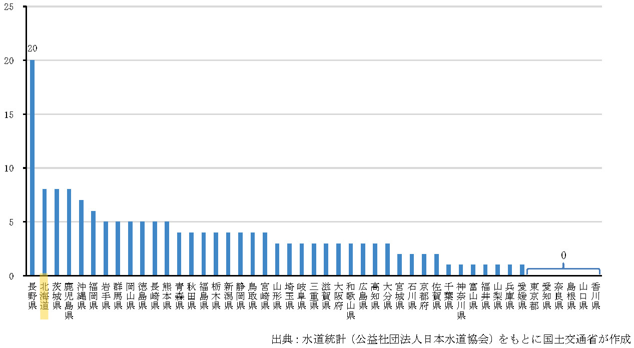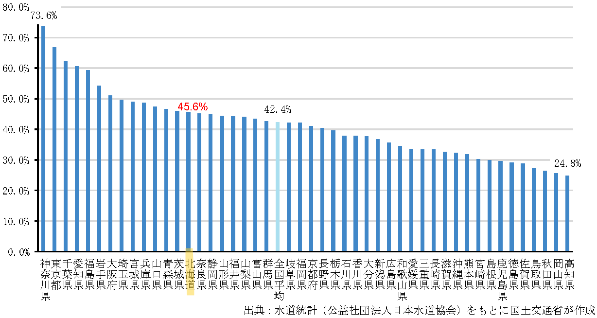 - 北海道の水道事業者等の基幹管路の耐震適合率は、45.6%と全国平均の42.4%より3.2ポイント高く、全国14位