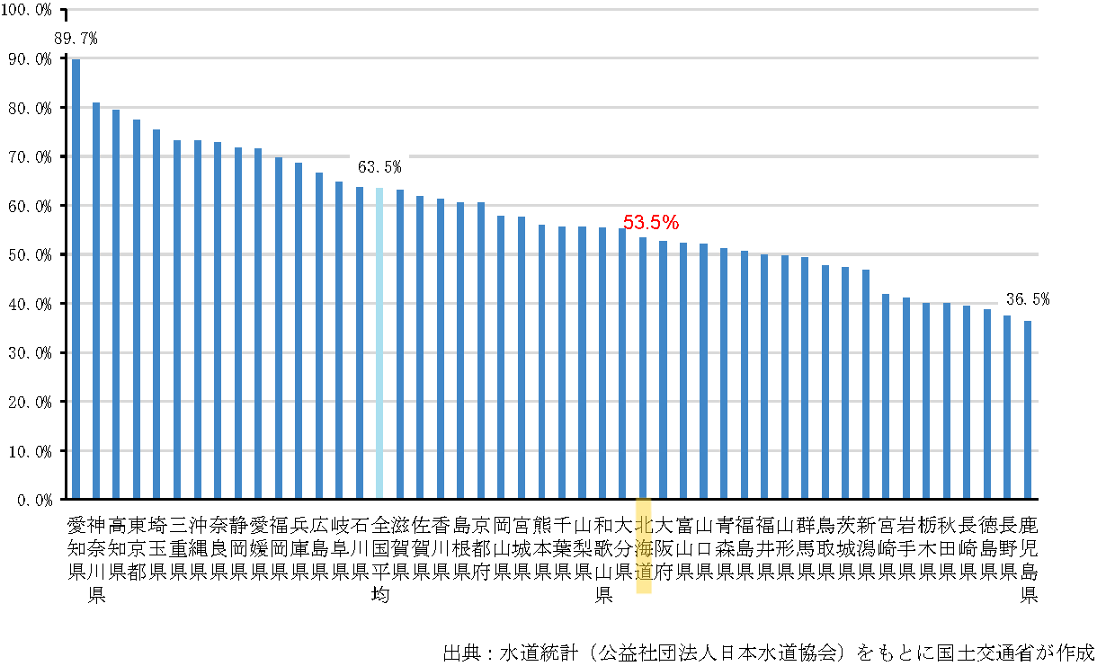 - 北海道の水道事業者等の配水池の耐震化率は、53.5%と全国平均の63.5%より10ポイント低く、全国28位