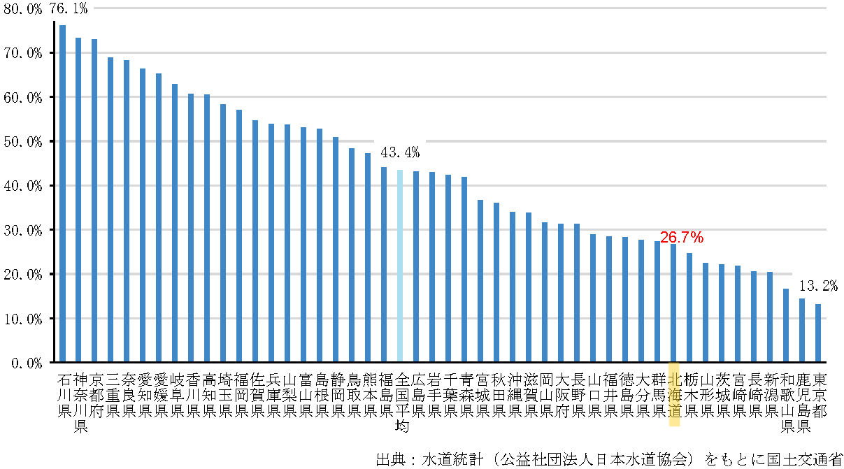 - 北海道の水道事業者等の浄水施設の耐震化率は、26.7%と全国平均の43.4%より16.7ポイント低く、全国ワースト10位