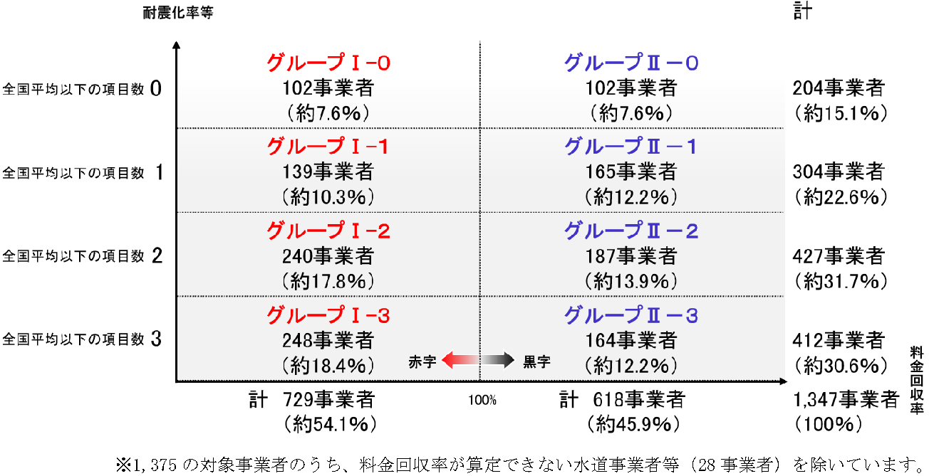 - グループⅠ-3【料金回収率が100%未満であり、かつ施設の耐震化率等が全て全国平均以下の水道事業者等】は18.4%