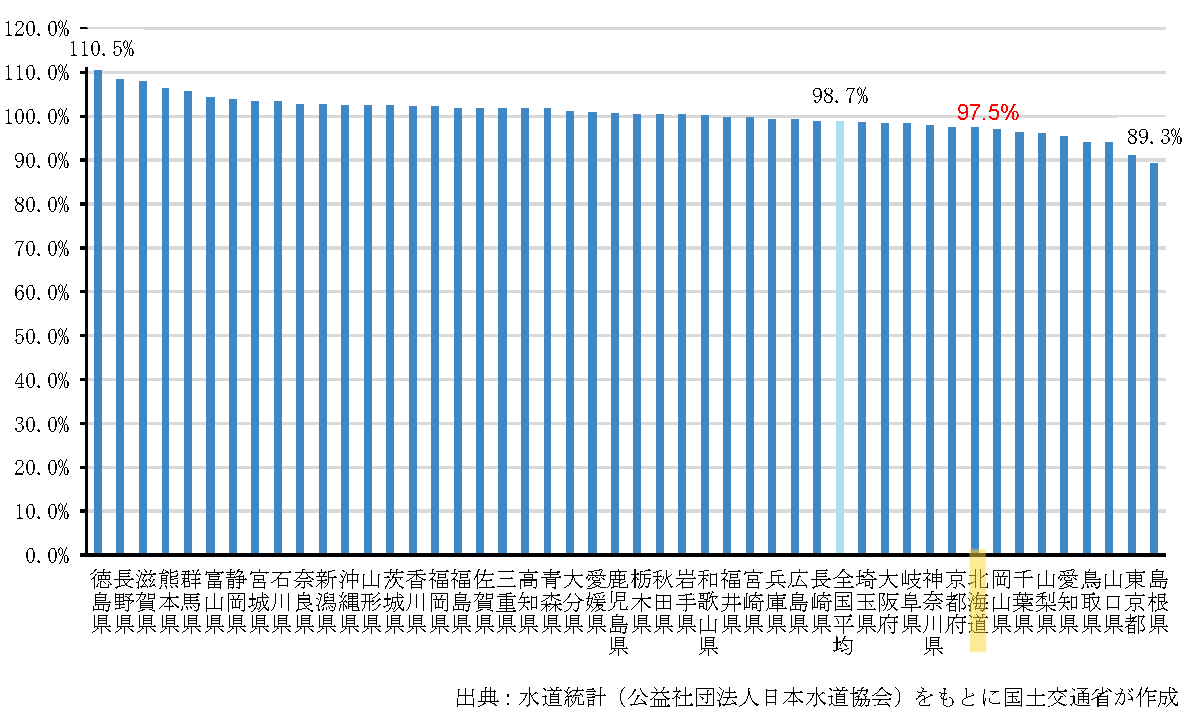 - 北海道の水道事業者等の料金回収率は、97.5%と全国平均の98.7%より1.2ポイント低く、全国ワースト9位